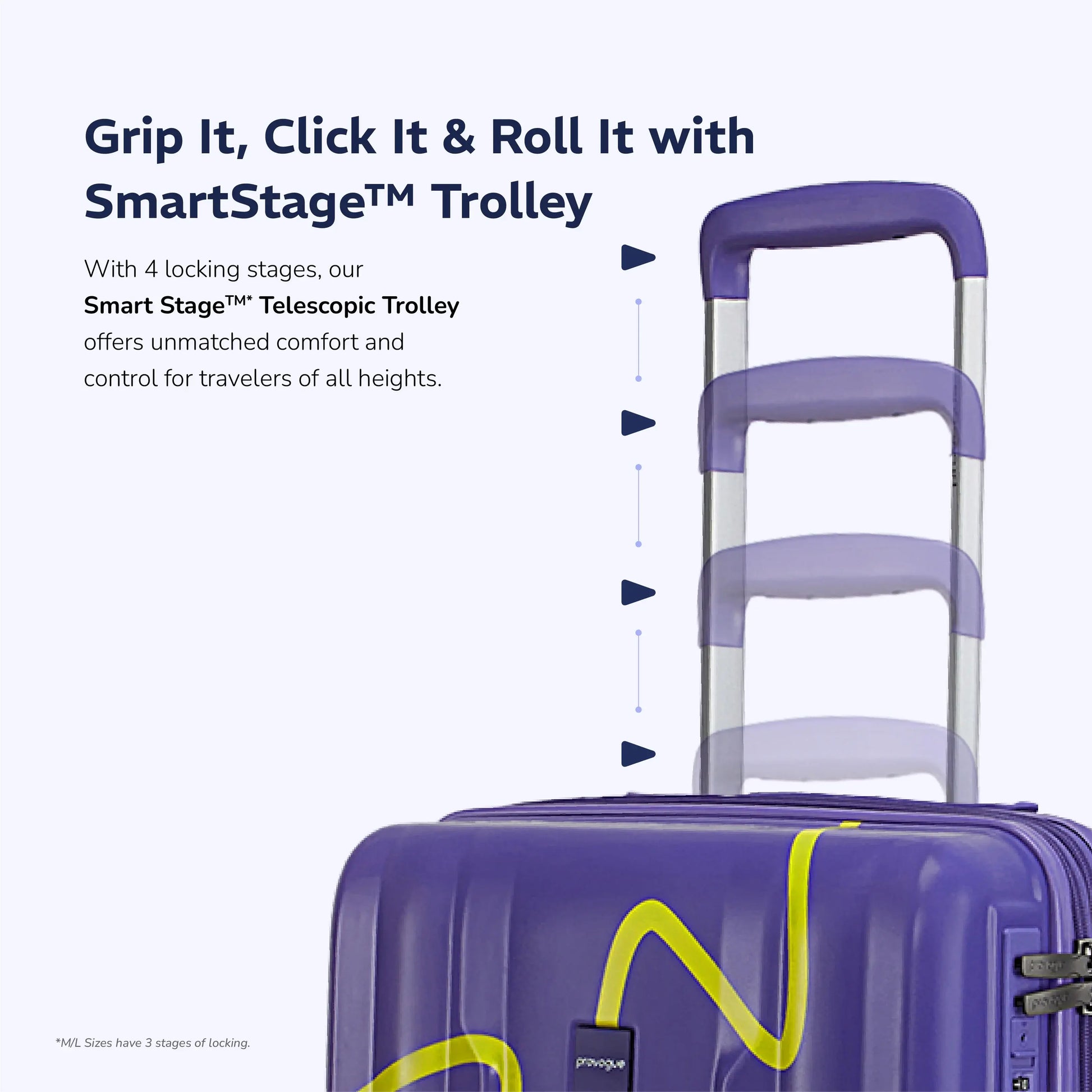 Smart Stage™ Telescopic Handle – Enhance your travel experience with the adjustable Smart Stage™ telescopic handle, available for these luggage bags. Designed for effortless mobility, this feature helps reduce pressure on your arms by allowing you to adjust the trolley bags height for maximum comfort.