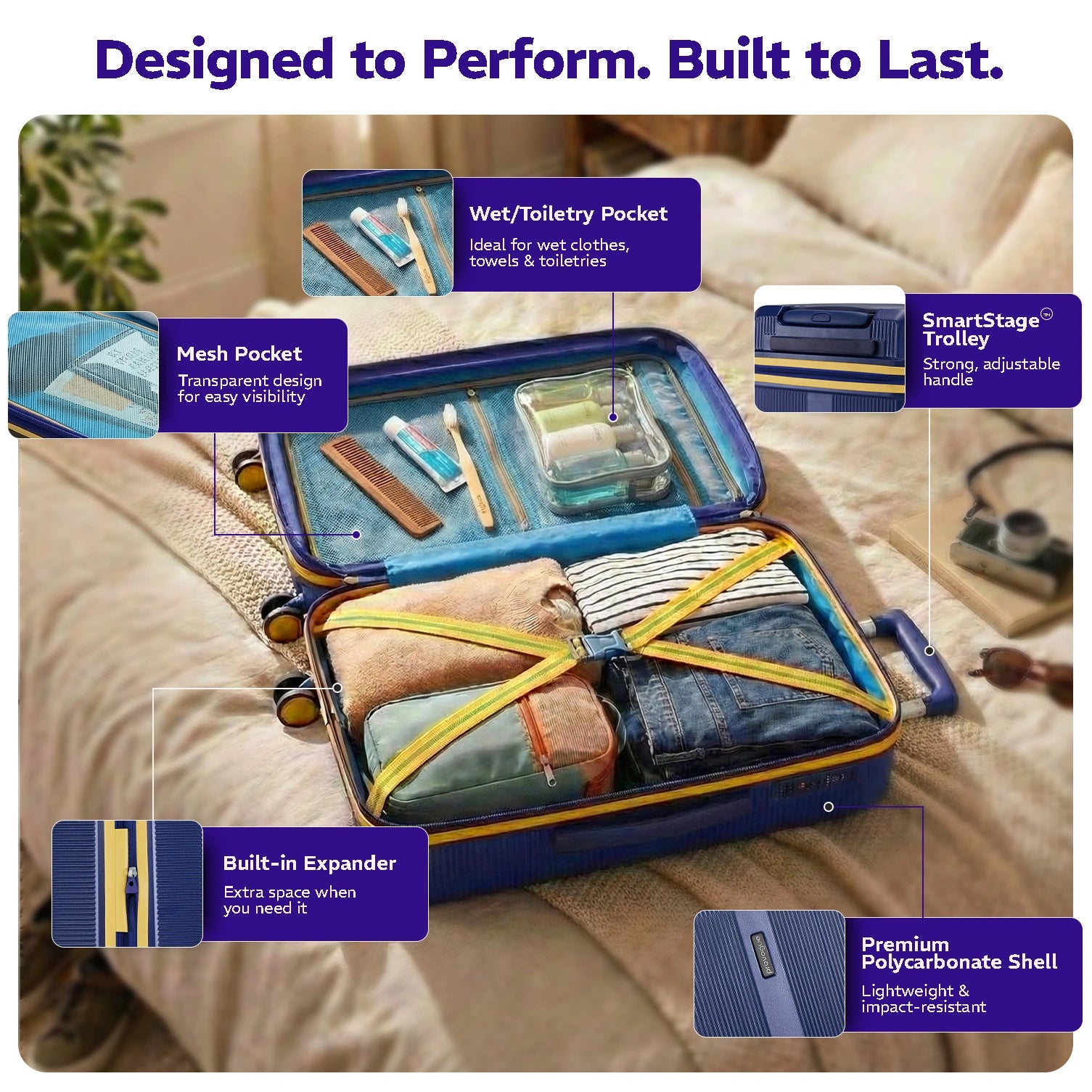 Crafted with a durable polycarbonate shell, the suitcase offers exceptional strength while remaining lightweight and impact-resistant. The aluminium trolley system ensures smooth handling and long-lasting performance, even through frequent airport runs. For seamless mobility, Primea is equipped with 8 multi-directional spinner wheels, allowing effortless 360-degree movement across terminals, hotel lobbies, and city streets.